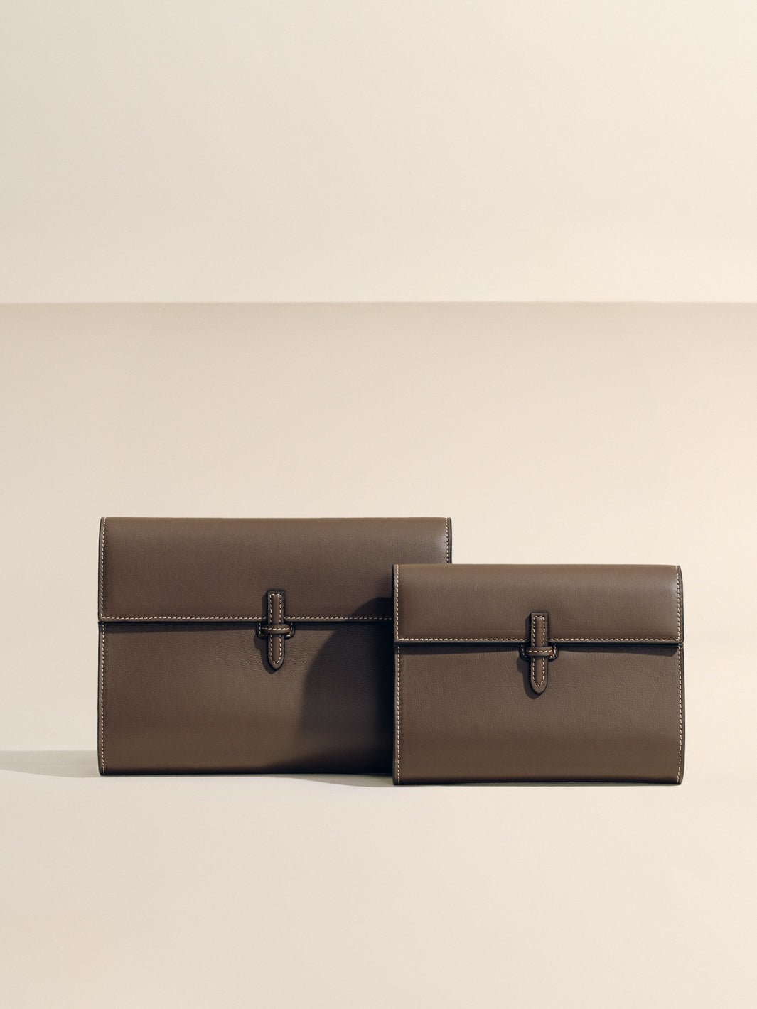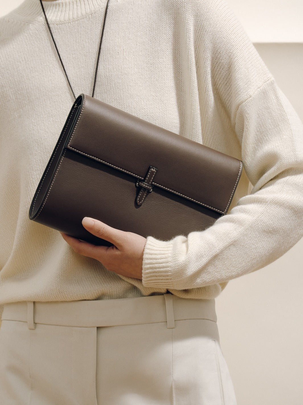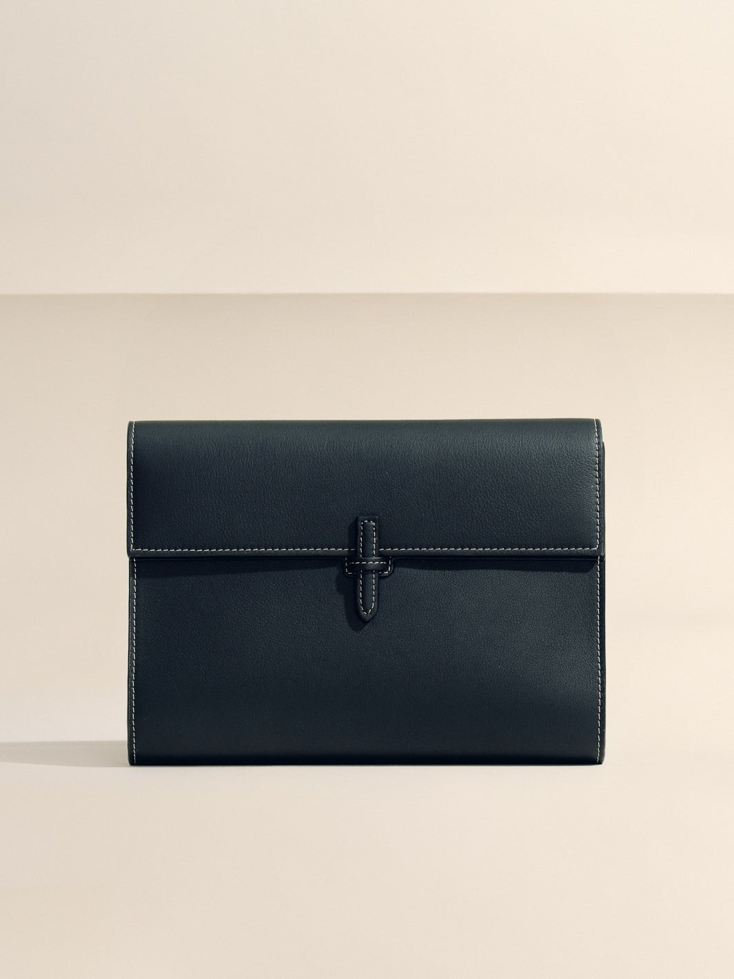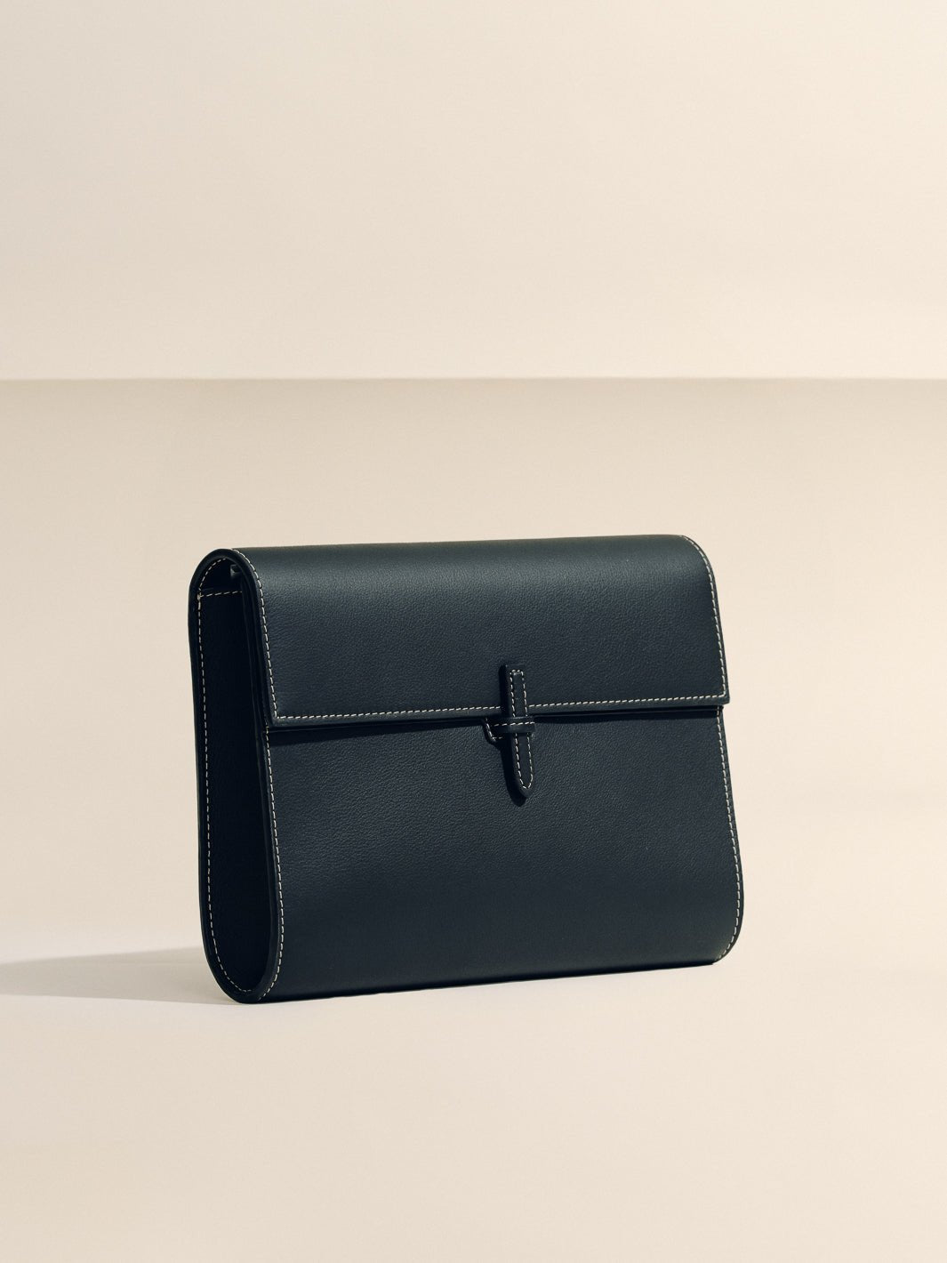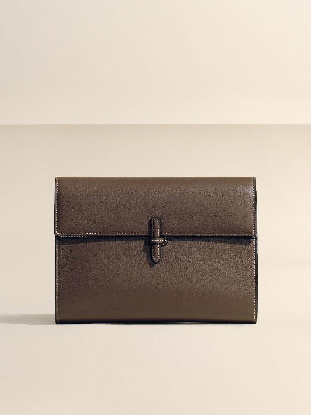 An evolution of our best-selling style, now reimagined in a larger silhouette. Crafted in supple leather and finished with our signature closure, this timeless piece offers more space while preserving its refined simplicity. Designed to be lightweight and versatile, it transitions seamlessly from day to evening, carried easily in hand or tucked under the arm. A modern update to a classic, balancing elegance with ease.