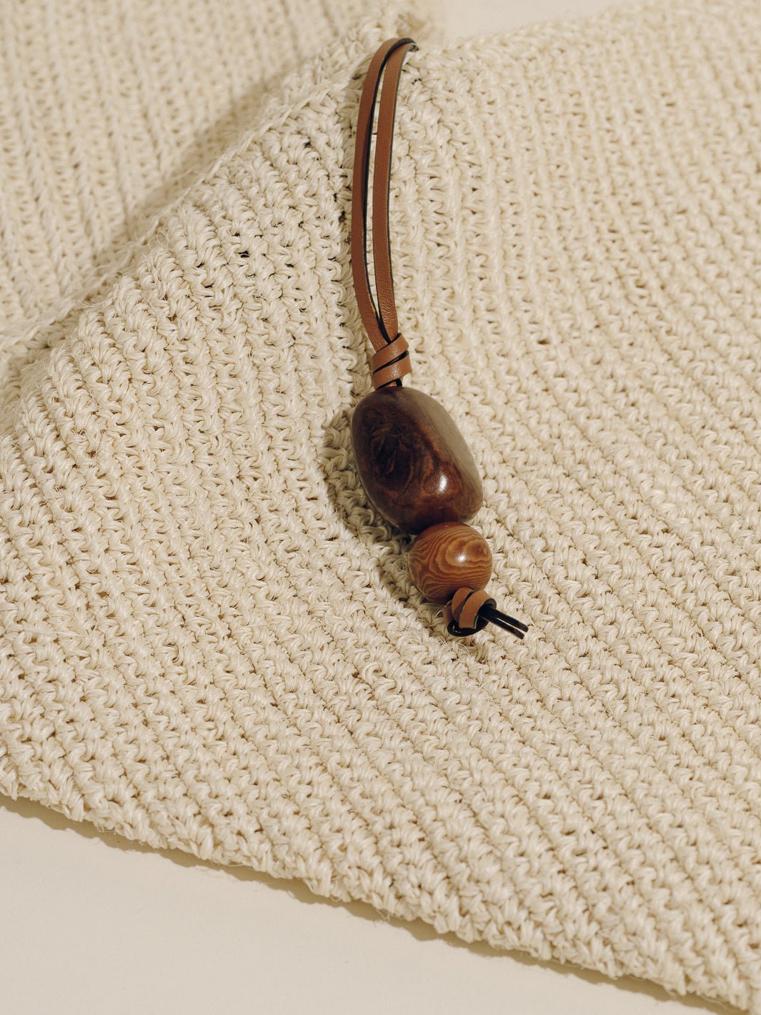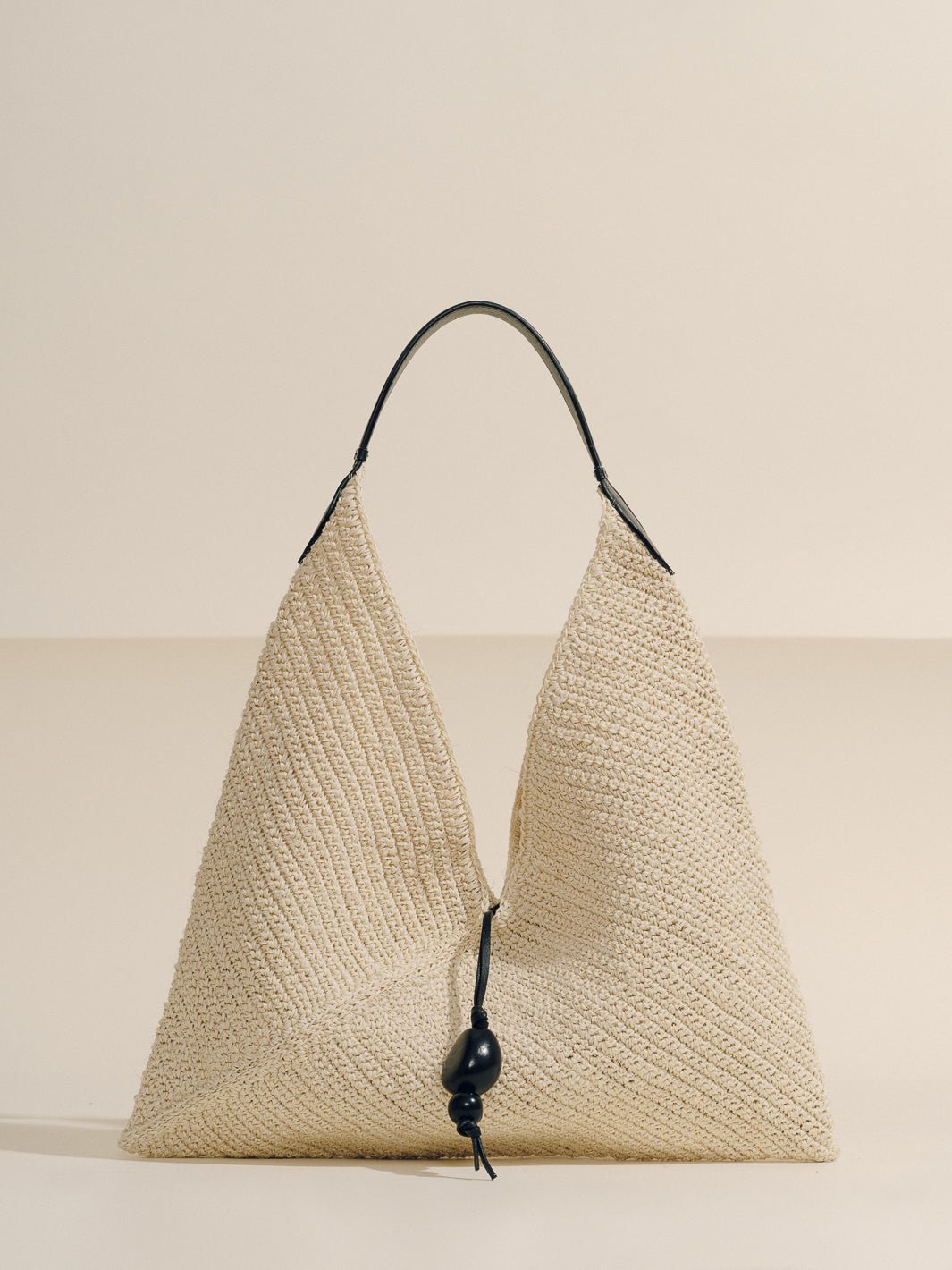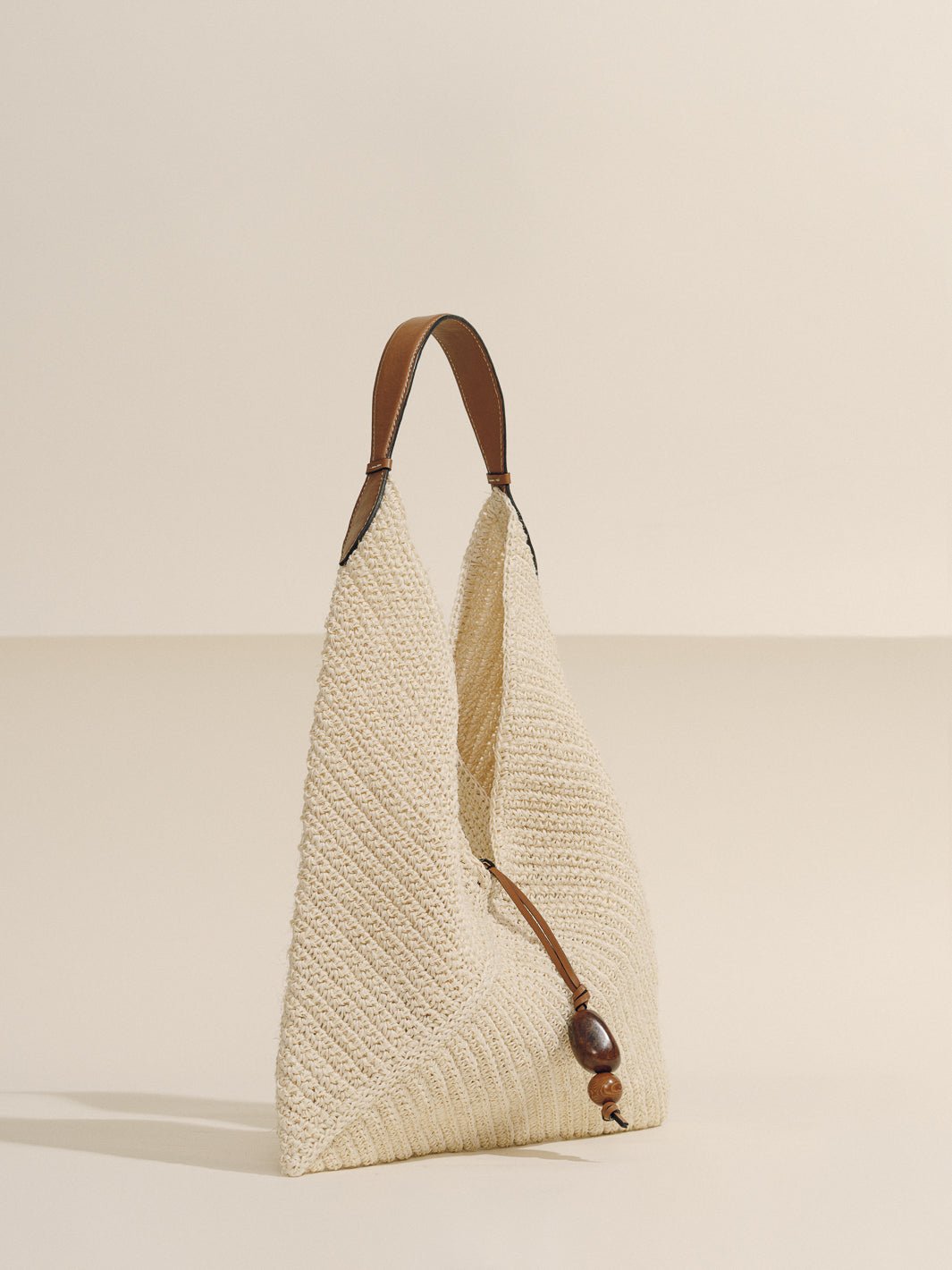 A delicate balance of form and function, its sculptural silhouette is complemented by a supple leather handle and a hand-carved tagua charm—an organic accent that nods to nature's quiet luxury. Perfectly packable, the Origami transitions seamlessly from beachside escapes to city strolls, embodying understated sophistication in every setting.