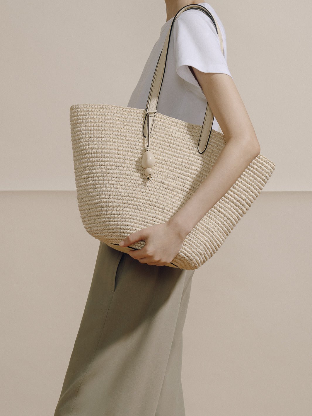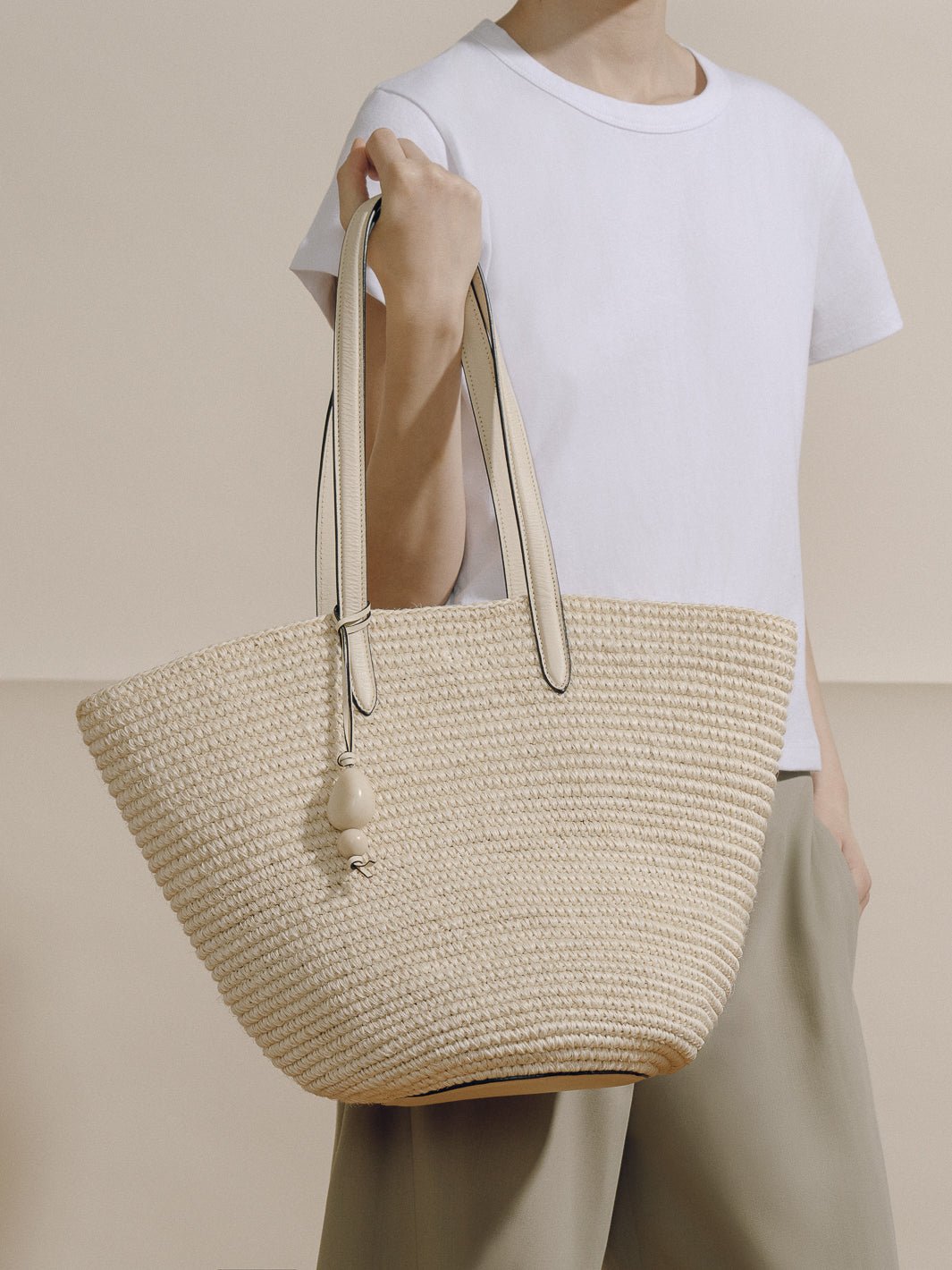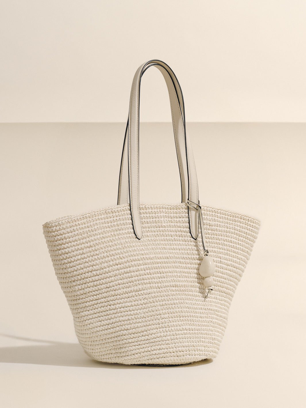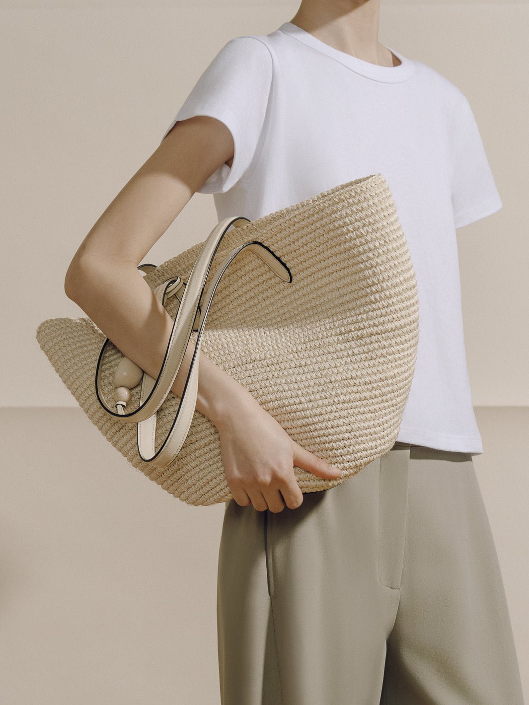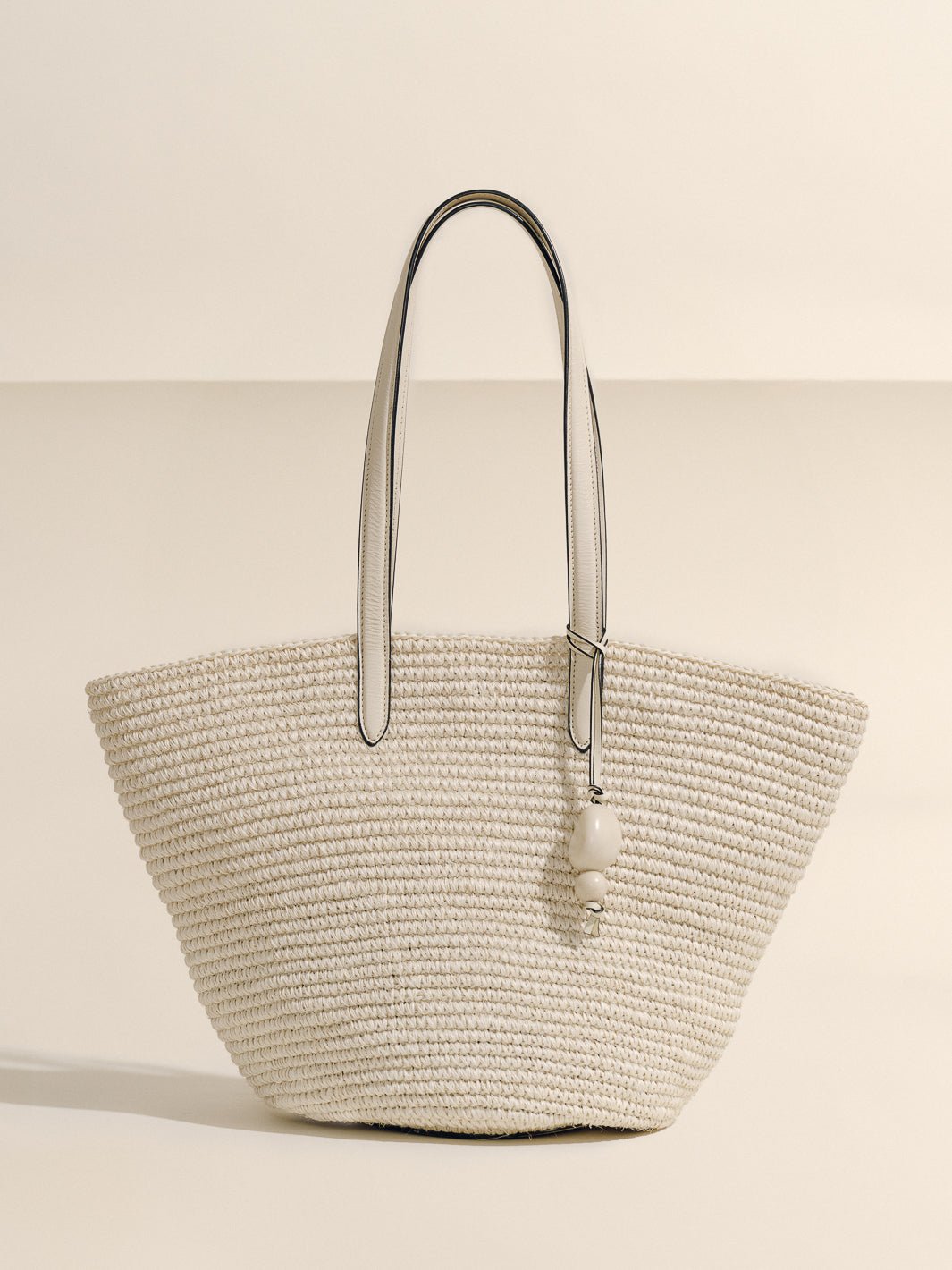 Crafted from handwoven natural fibers and trimmed in nappa leather, the Market Tote is lightweight, spacious, and packable. Designed for ease, it features comfortable leather handles, a signature tagua charm, an interior pocket, and a tie closure to keep essentials organized and secure.