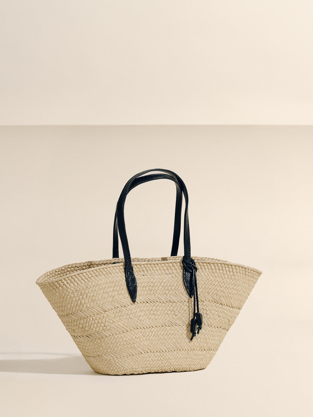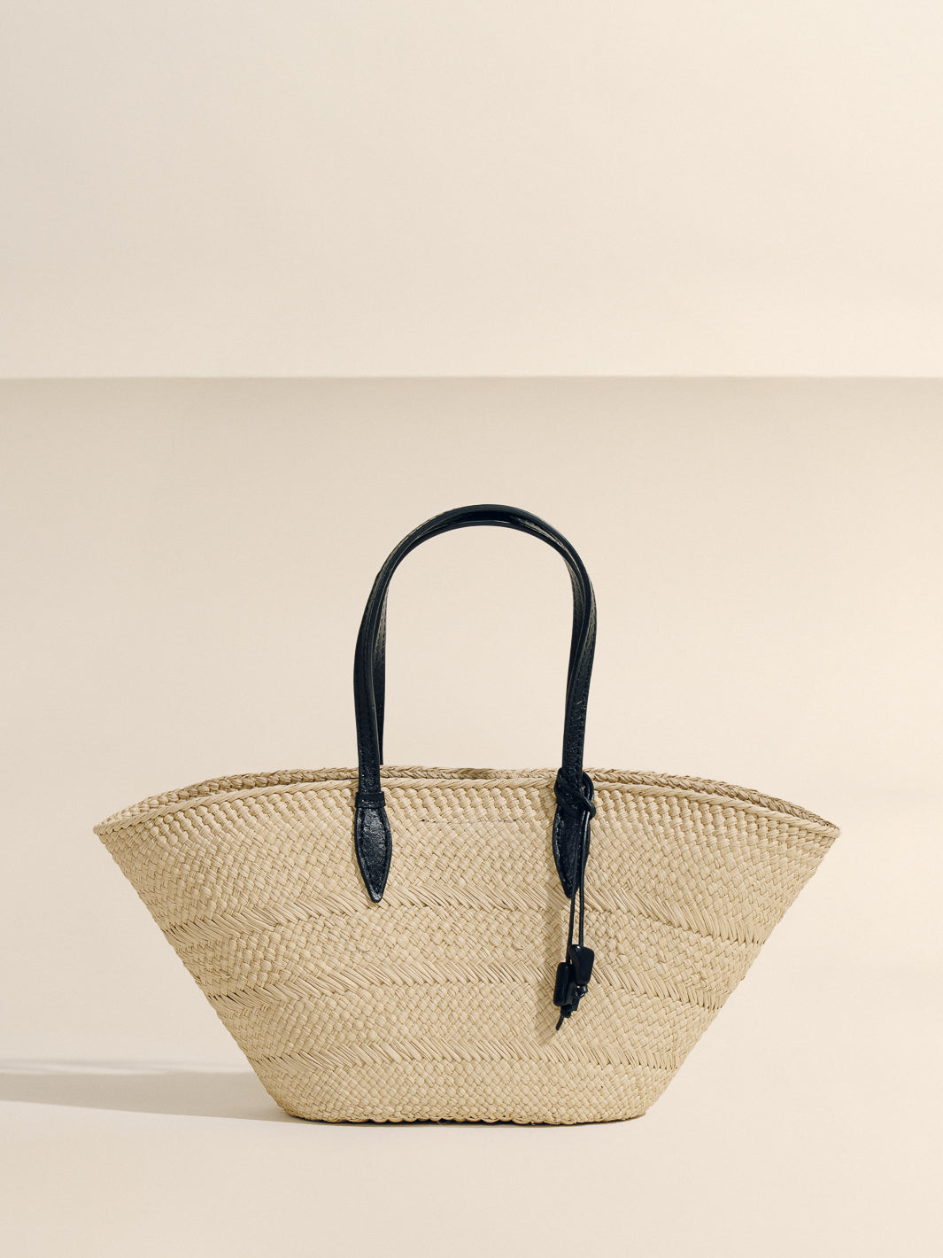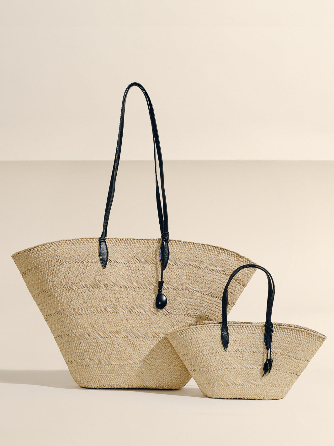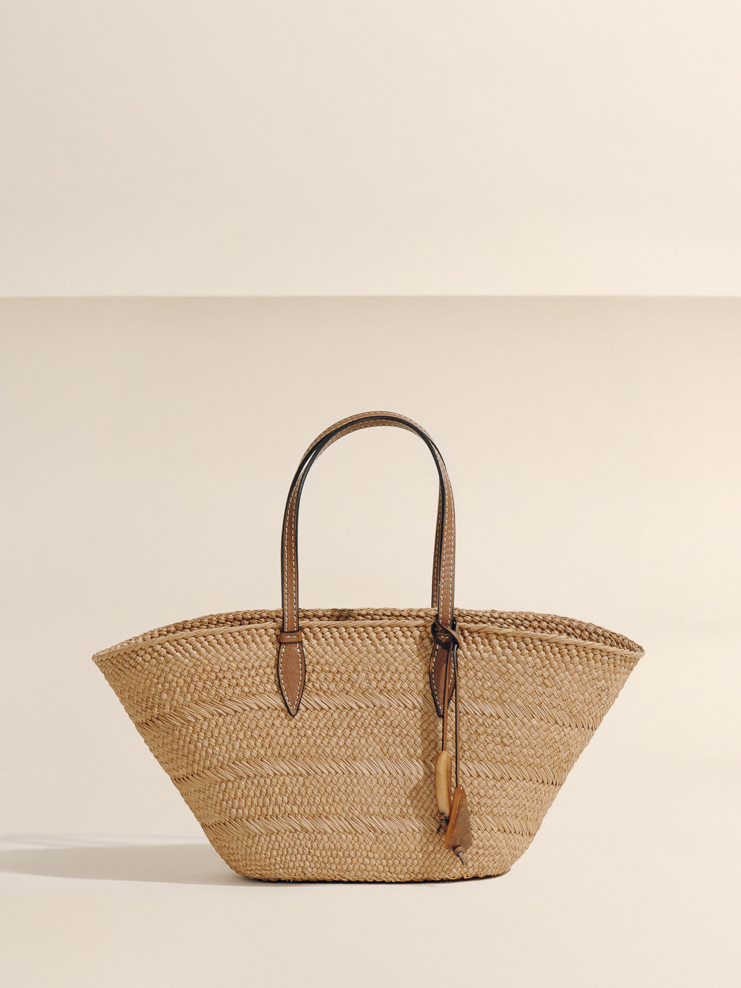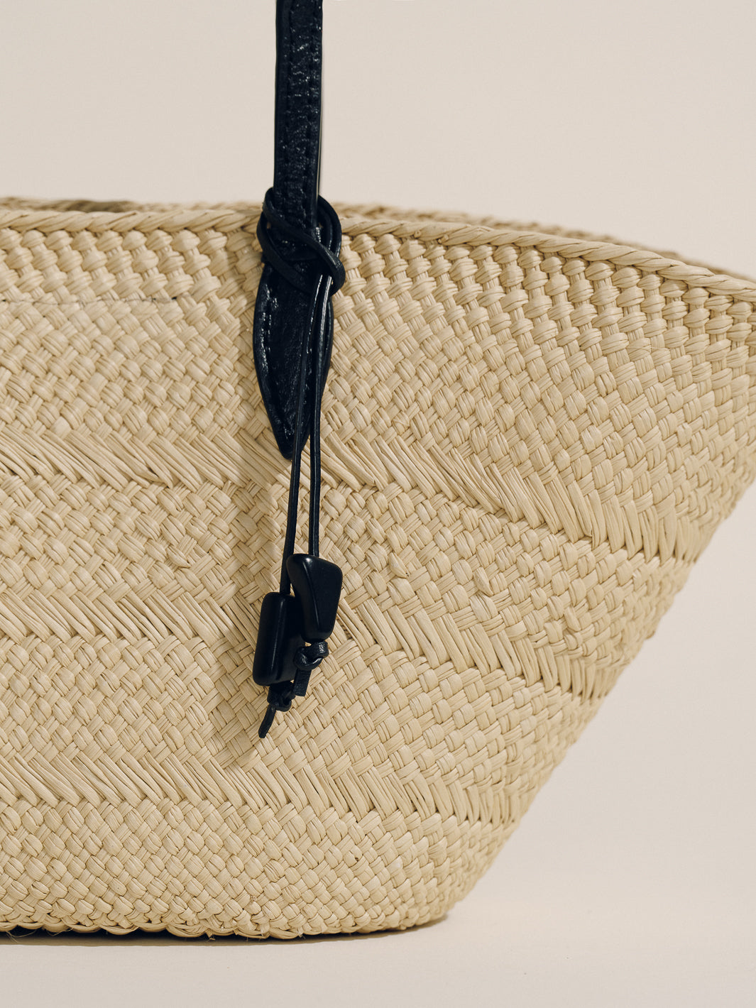 The new Trapeze Basket centers the weave as its defining gesture. The natural rhythm of handwoven iraca remains fully visible, framed by precise, linear leather straps that bring structure without overpowering the craft.